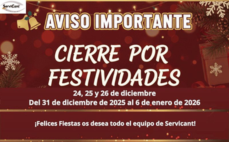 Desde Servicant, queremos informar a todos nuestros clientes, colaboradores y proveedores que, con motivo de las fiestas navideñas, nuestras instalaciones permanecerán cerradas en las siguientes fechas: